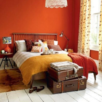 Không gian phòng ngủ toát lên sự ấm áp với những bức tường màu đất nung ấn tượng và độc đáo. Đây sẽ là màu sắc tuyệt vời cho những ai không quá yêu thích sự bứt phá, nhưng vẫn mang lại cảm giác mới mẻ, năng động mà không quá màu mè cho gia chủ, phù hợp với các bạn trẻ.