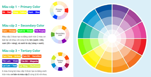Nhóm cấp 1: đỏ, vàng, lam (nếu phối 2 màu của nhóm 1 sẽ tạo thành các màu nhóm 2)