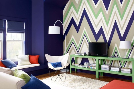 Nếu cảm thấy những đường kẻ sọc quá cứng nhắc hay lỗi thời thì hãy thử một cách gì đó mới lạ hơn như những đường sóng sắc màu, tạo cảm giác bắt mắt nếu sử dụng nhiều hơn 2 màu sắc tương phản. Với cách này, các gia chủ có thể tự do sáng tạo làm cho bức tường như một mảng tranh đặc sắc, ấn tượng.